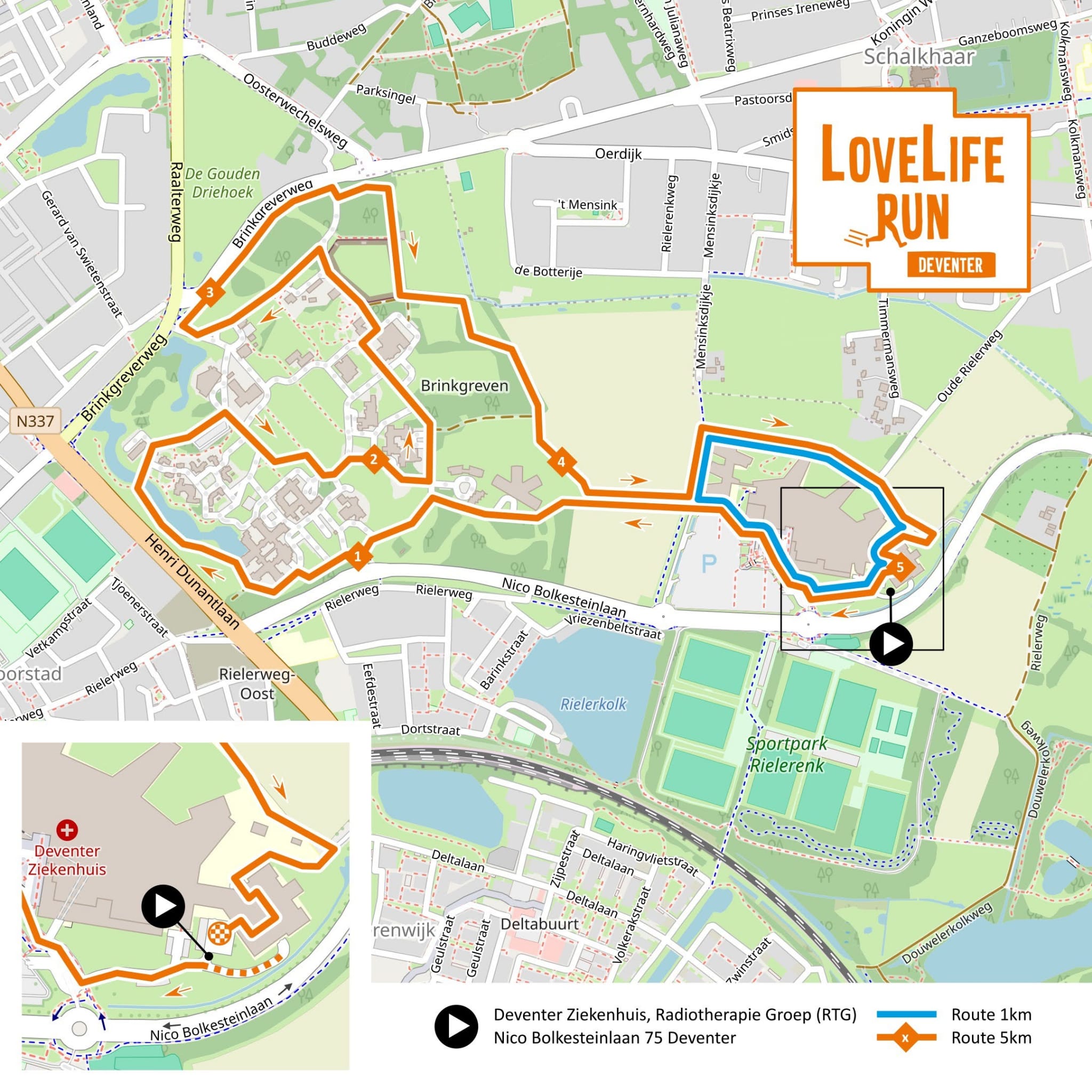 De start van de LLR Deventer 2025 is bij de Radiotherapie Groep (RTG) naast het Deventer Ziekenhuis (DZ). Wanneer je je ingeschreven hebt voor de 1 km is de route een rondje rond het DZ. De route van 5 km gaat over het Brinkgreven terrein.